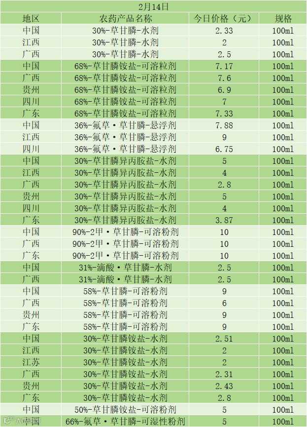 📅 2 月 10 日草甘膦类农药零售价(100ml 规格)