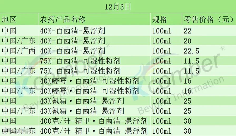 40% 百菌清悬浮剂:中国22元/100ml,广西为22.5元/100ml,广东明显更低,仅 20元/100ml。