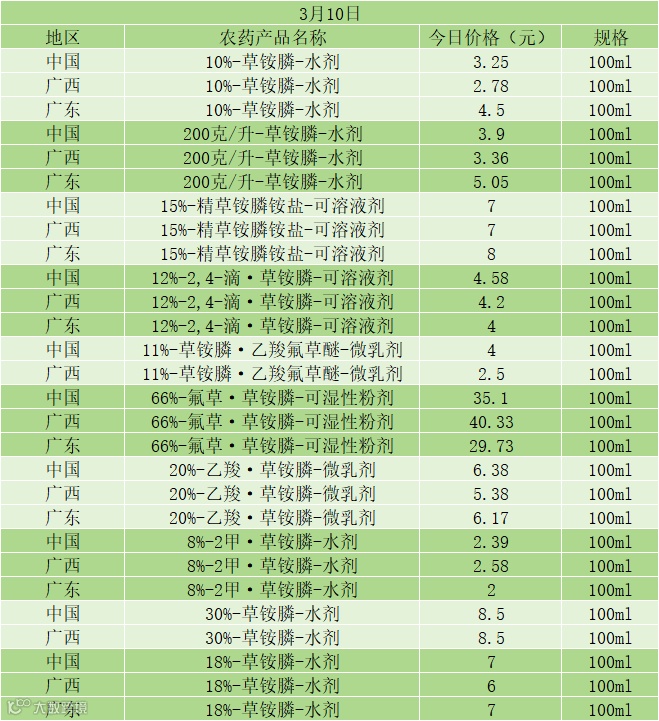 10%- 草铵膦 - 水剂:中国 3.25 元、广西 2.78 元、广东 4.5 元