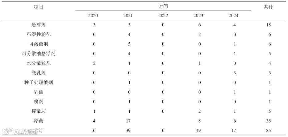 数据显示,2020-2024年间,中国共批准登记了45个新农药,包含49种新有效成分,85个新产品。其中71%以上的新农药实现了原/母药与制剂同步登记,显示出企业对新品种开发的整体布局意识增强。