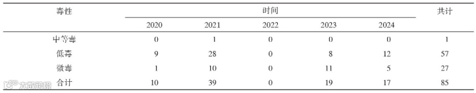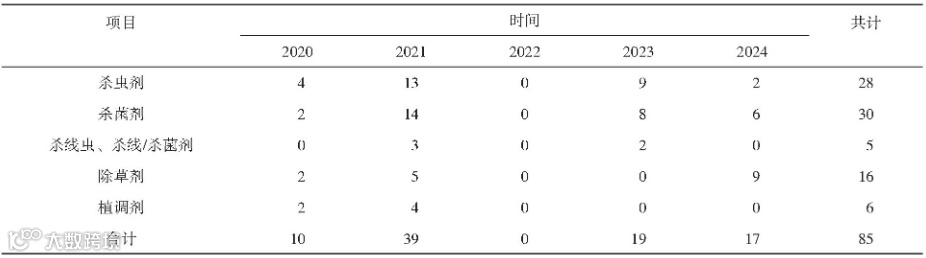 从年度分布来看:2020年:6个;2021年:21个(含23个有效成分);2022年:空白;2023年:10个;2024年:8个(含10个有效成分)。