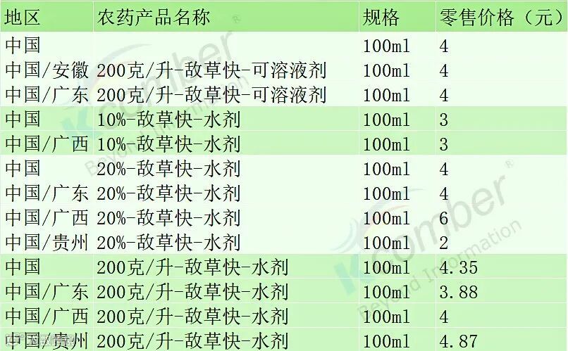 20%-敌草快-水剂:全国与广东均价4元,广西6元,贵州2元。