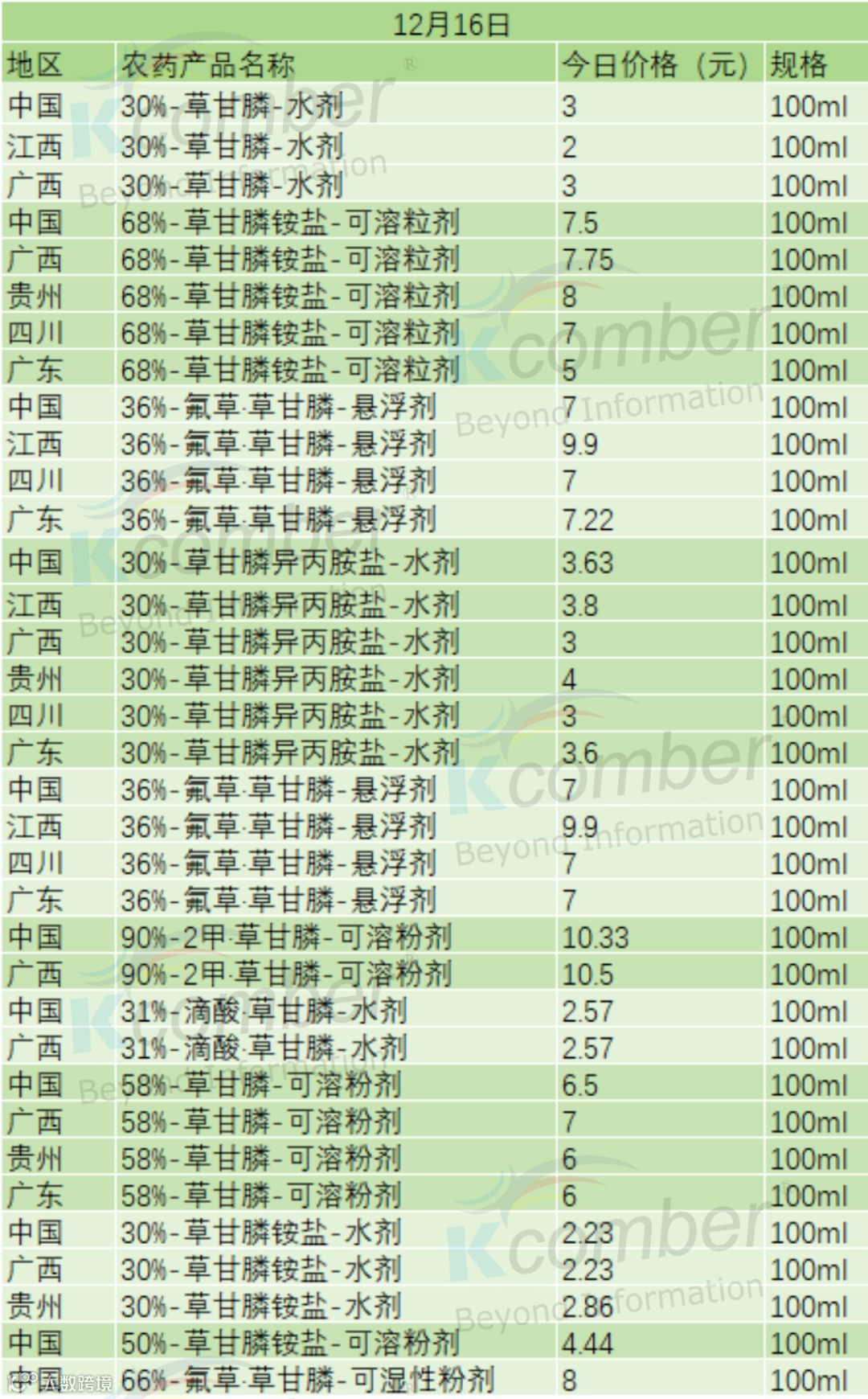 📅 12 月 16 日草甘膦类农药零售价(100ml 规格)