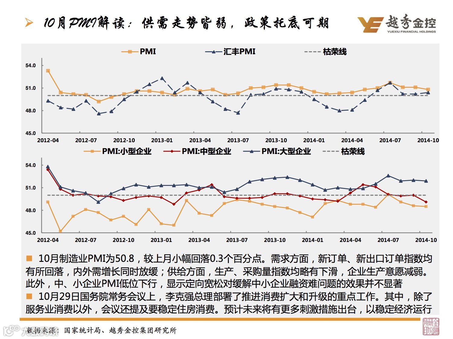 导读:10月制造业PMI为50.8,需求、供给方面各分项均有小幅回落。预计未来政府将继续出台定向刺激措施,以稳定经