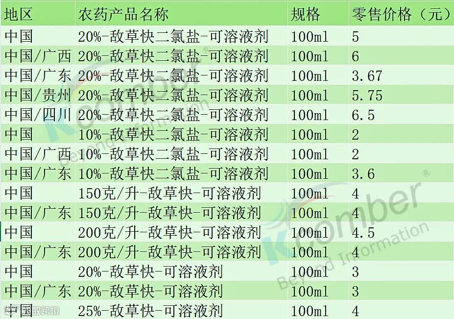 150克/升-敌草快-可溶液剂:全国与广东均价4元。