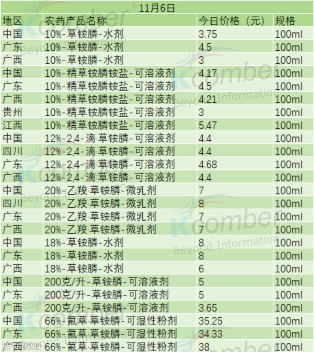 11月6日草铵膦及复配制剂主要市场报价(100ml)