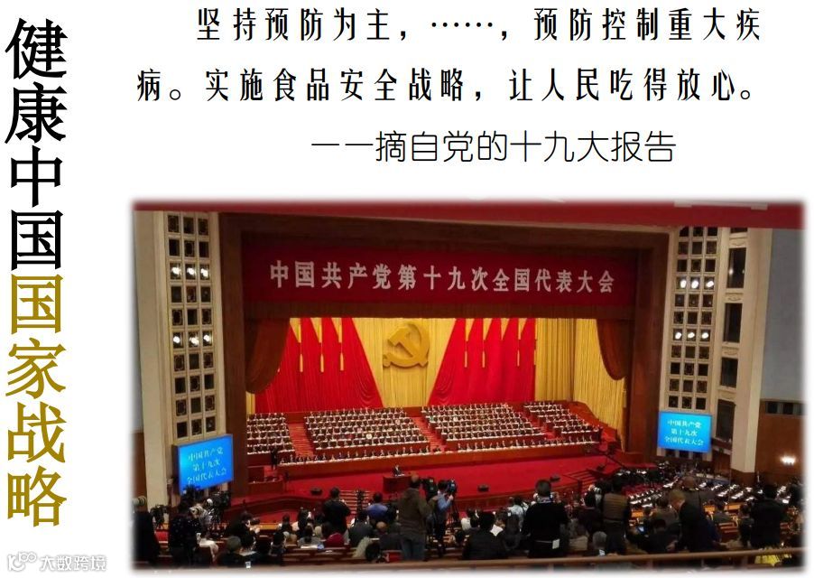 党的十九大报告提出“坚持预防为主,……,预防控制重大疾病。实施食品安全战略,让人民吃得放心。”