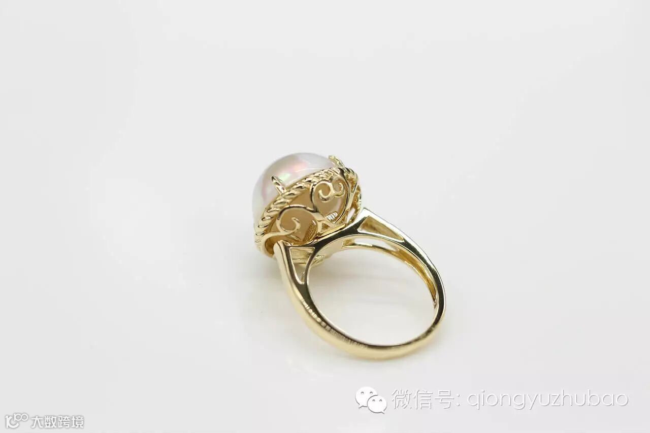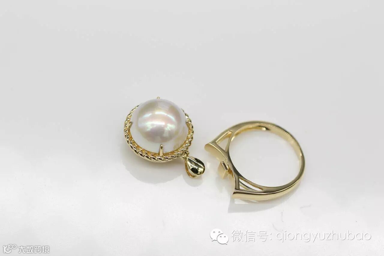 与翡翠蛋面气质不同,但形态很相似的马贝,是属于附壳珍珠的一种,直径一般10-15mm,马贝之所以做此款很美的缘故,因为不像普通珍珠那么那样拱起太高,平面面积又大,这一颗比较大的马贝,色泽纯白纯净,光泽优雅含蓄,所以作为吊坠戒指两用款,佩戴效果夸张,设计感强,大气,又不失优雅含蓄。