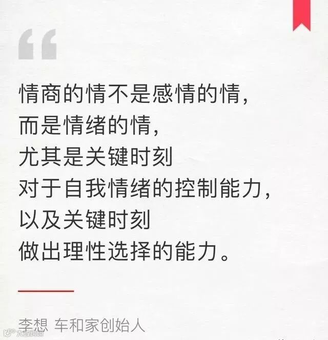 车和家创始人李想曾说:不少朋友不清楚什么是情商。这个情不是感情的情,而是情绪的情,尤其是关键时刻对于自我情绪的控制能力,以及关键时刻做出理性选择的能力。
