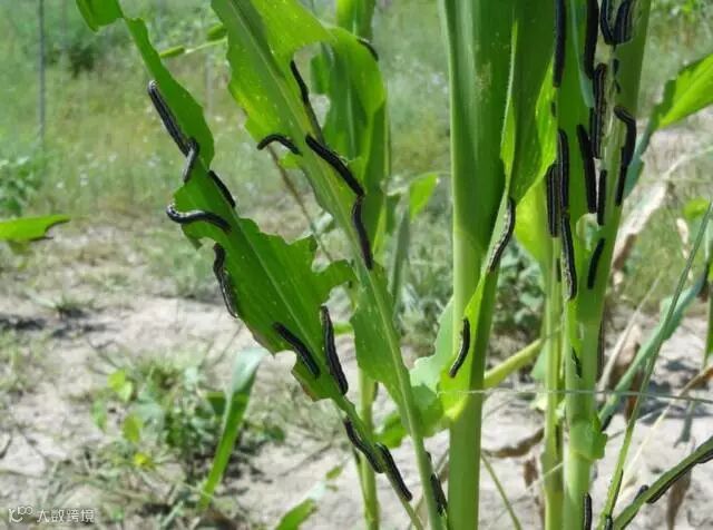 玉米粘虫以幼虫暴食玉米叶片,严重发生时,短期内吃光叶片,造成减产甚至绝收。为害症状主要以幼虫咬食叶片。1~2龄幼虫取食叶片造成孔洞,3龄以上幼虫危害叶片后呈现不规则的缺口,暴食时,可吃光叶片。大范围发生时将玉米叶片吃光,只剩叶脉,造成严重减产,甚至绝收。当一块田玉米被吃光,幼虫常成群列纵队迁到另一块田为害,故又名“行军虫”。一般地势低、玉米植株高矮不齐、杂草丛生的田块受害重。