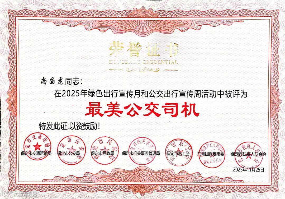 近日,在保定市交通运输局、市公安局等六部门联合开展的2025年“最美公交司机”推选宣传活动中,河北保定交通运输集团有限公司尚国龙、史海彬两位同志凭借数十年如一日的爱岗敬业、精湛过硬的专业技能及温暖贴心的服务口碑,成功斩获“最美公交司机”荣誉称号,为集团赢得了行业认可与社会赞誉。