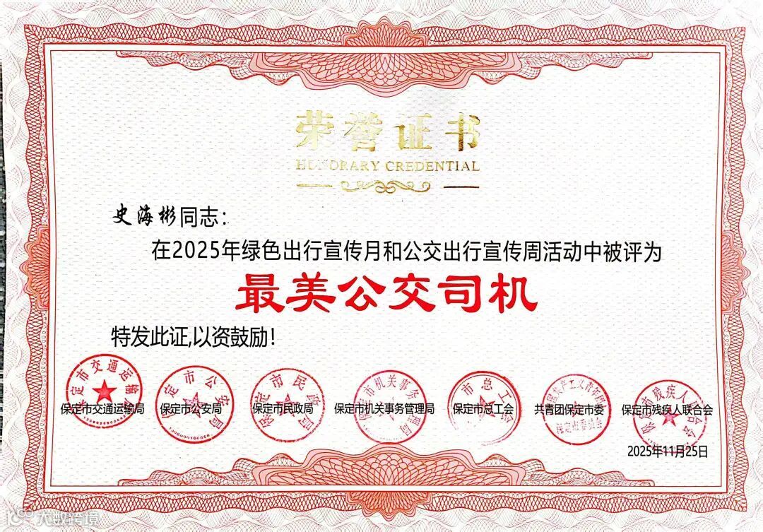 此次两位同志获评“最美公交司机”,既是对个人辛勤付出的高度肯定,也是对保运集团公共交通服务工作的充分认可。未来,集团公司将以两位先进典型为榜样,进一步弘扬行业正能量,凝聚发展合力,持续提升服务质量与运营效率,为广大群众提供更安全、便捷、温馨的出行服务,为保定城市公共交通事业高质量发展贡献保运力量!