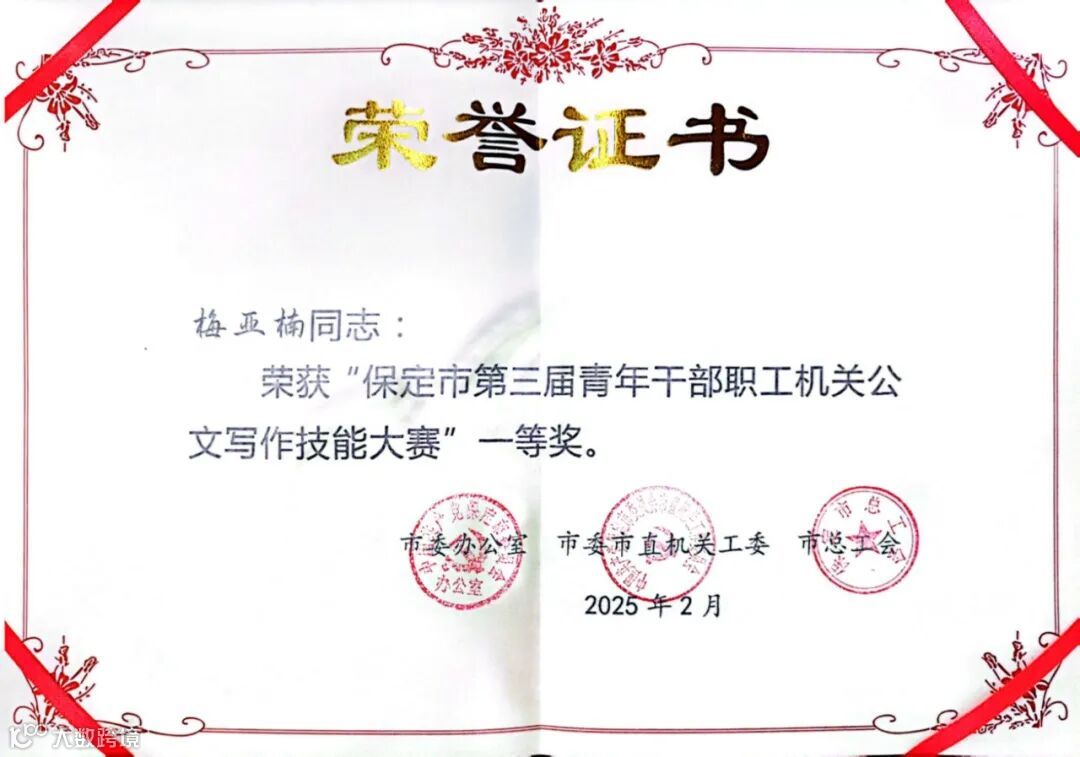 2025年3月25日下午,保定市第三届青年干部职工机关公文写作技能大赛获奖人员颁奖座谈会在市委大院7号楼299会议室召开。市委副秘书长冯颖文主持,市直机关工委、市总工会有关负责同志,三个赛区的一等奖选手代表和组委会综合组部分成员参加座谈交流会。