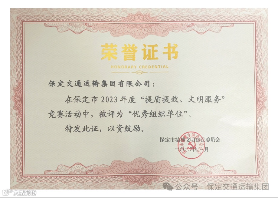 集团公司凭借在“提质提效、文明服务”方面的卓越表现,荣膺市2023年度“提质提效、文明服务”竞赛优秀组织单位荣誉称号,集团公司汽贸、物流等单位榜上有名。