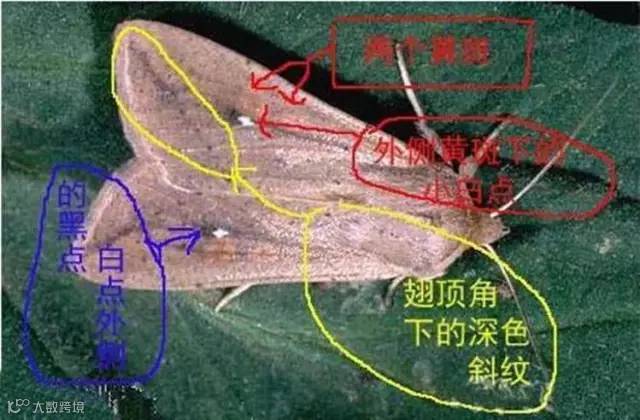 玉米粘虫:成虫体长17-20毫米,淡灰褐色或黄褐色,雄蛾色较深。前翅有两个土黄色圆斑,外侧圆斑的下方有一小白点,白点两侧各有一小黑点,翅顶角有1条深褐色斜纹。