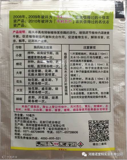 超天丰属广谱型植物生长调节剂,内含进口芸苔素内酯0.02%及公司独创激活元素,在各种作物上使用都能体现出良好的效果。超天丰具有抑制植物某些酶的活性,增强调节植物内源激素平衡,促进植物新陈代谢和光合作用,促进植物生长,解除冻害,抗涝,抗旱,达到丰收效果。