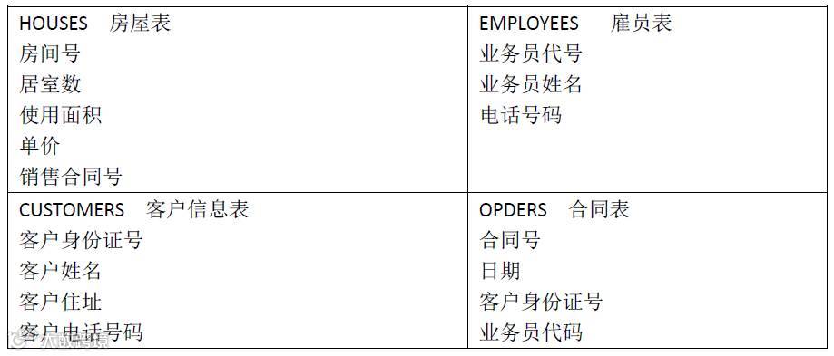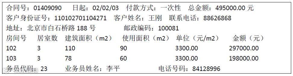 假设某房地产公司聘用多名业务员负责房地产的销售业务,每名客户可以多次或一次购买多套住房,每套住房有唯一的标志,合同事例如下图所示: