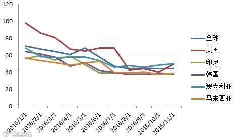 图1: 2016年1月~11月中国草铵膦5大出口国价格指数