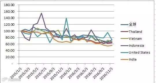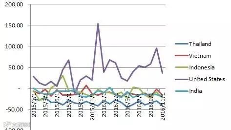 图3:2015年1月~2016年11月 中国阿维菌素前五大出口国价格指数与全球平均价格指数的对比(设定值为0)