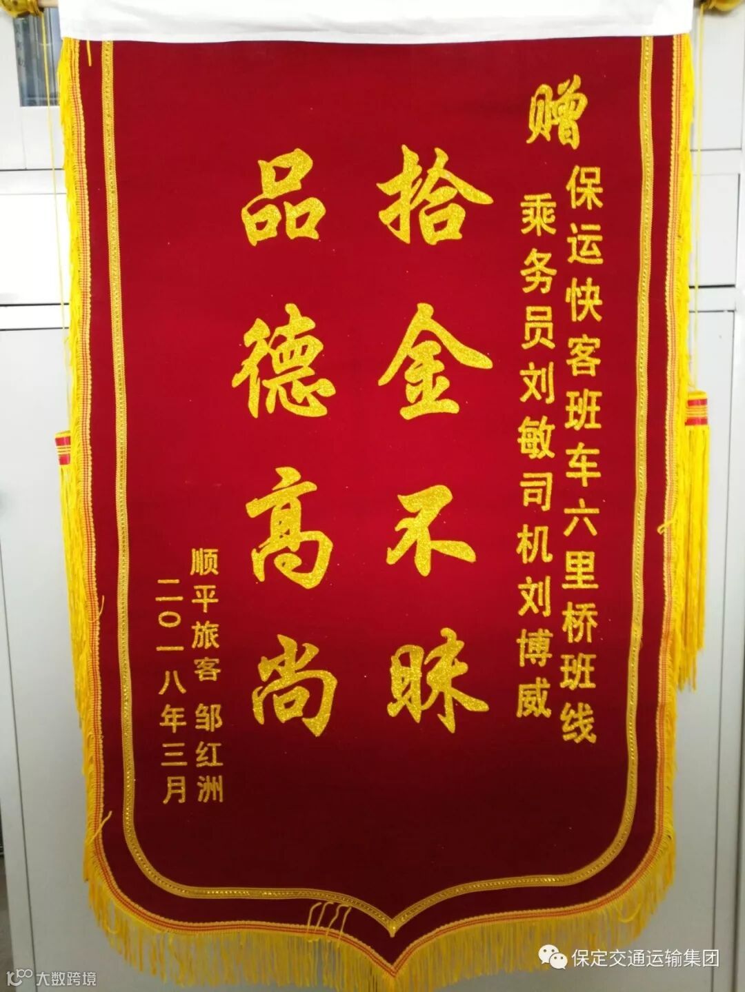 晚上失主打电话来寻找手机,当听到手机已经被保管好,一颗焦急的心才踏实下来。原来,失主邹红洲是顺平人,到家后才发现手机丢了,因为不知道在何时何地丢的手机,只能尝试着给自己的手机打电话,当手机接通的一瞬间,激动的心情溢于言表。由于当天时间太晚了,失主拜托乘务队继续帮他保管手机,约定好时间来取。几天后,失主来取手机的同时专门送来一面写有“拾金不昧,品德高尚”的锦旗表示谢意。