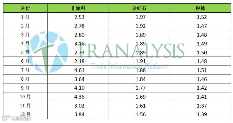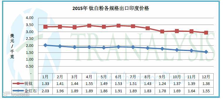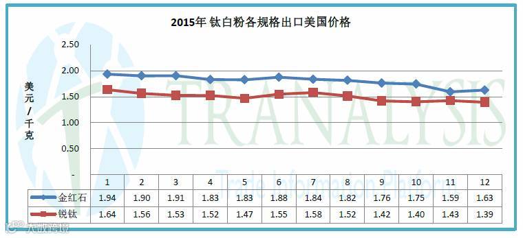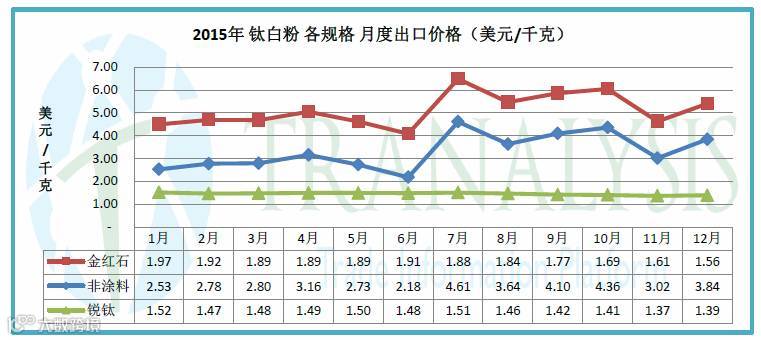 表1:2015年 钛白粉 各规格 月度出口价格(美元/千克)