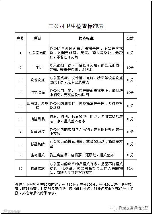 二是开展环境卫生整饬活动,制定卫生清理标准,每月24日定为公司卫生清理日,全体职工参与,对办公区、车站内外、南北两院及公交院内进行卫生大清理,并组织专人对卫生清理情况进行检查、考核,通过卫生清理活动,公司办公环境得到提升。