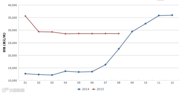 2015年8月,中国饲料级500,000IU/g维生素D3价格依旧较为稳定,价格维持在175,000 元/吨左右(USD28,608/t),与上个月持平。而这一价格自2015年4月以来已经持续5月之久。