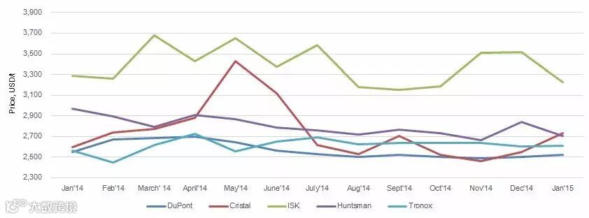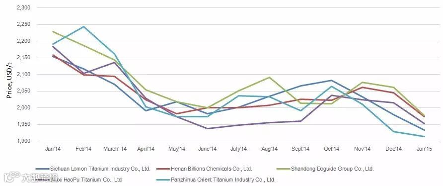 Figure4: Import prices of TiO2 from world's top five TiO2 producers, Jan. 2014–Jan.2015