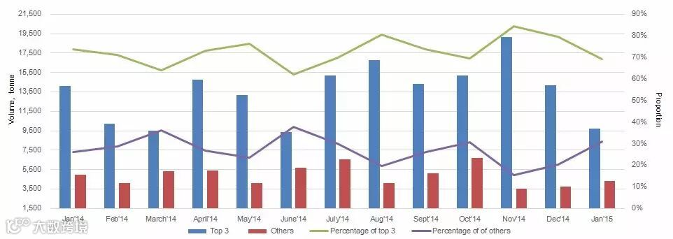 Figure3: Market shares of world's top three TiO2 producers in Chinese market byvolume, Jan. 2014–Jan. 2015