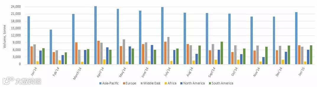 2014年4月-2015年4月,中国钛白粉在不同地区的出口总量