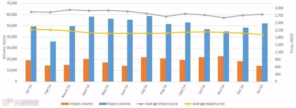 Figure1: Imports and exports of TiO2 in China, Jan. 2014–Jan. 2015