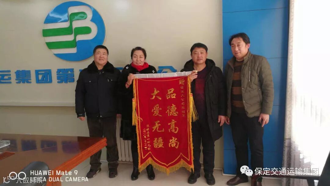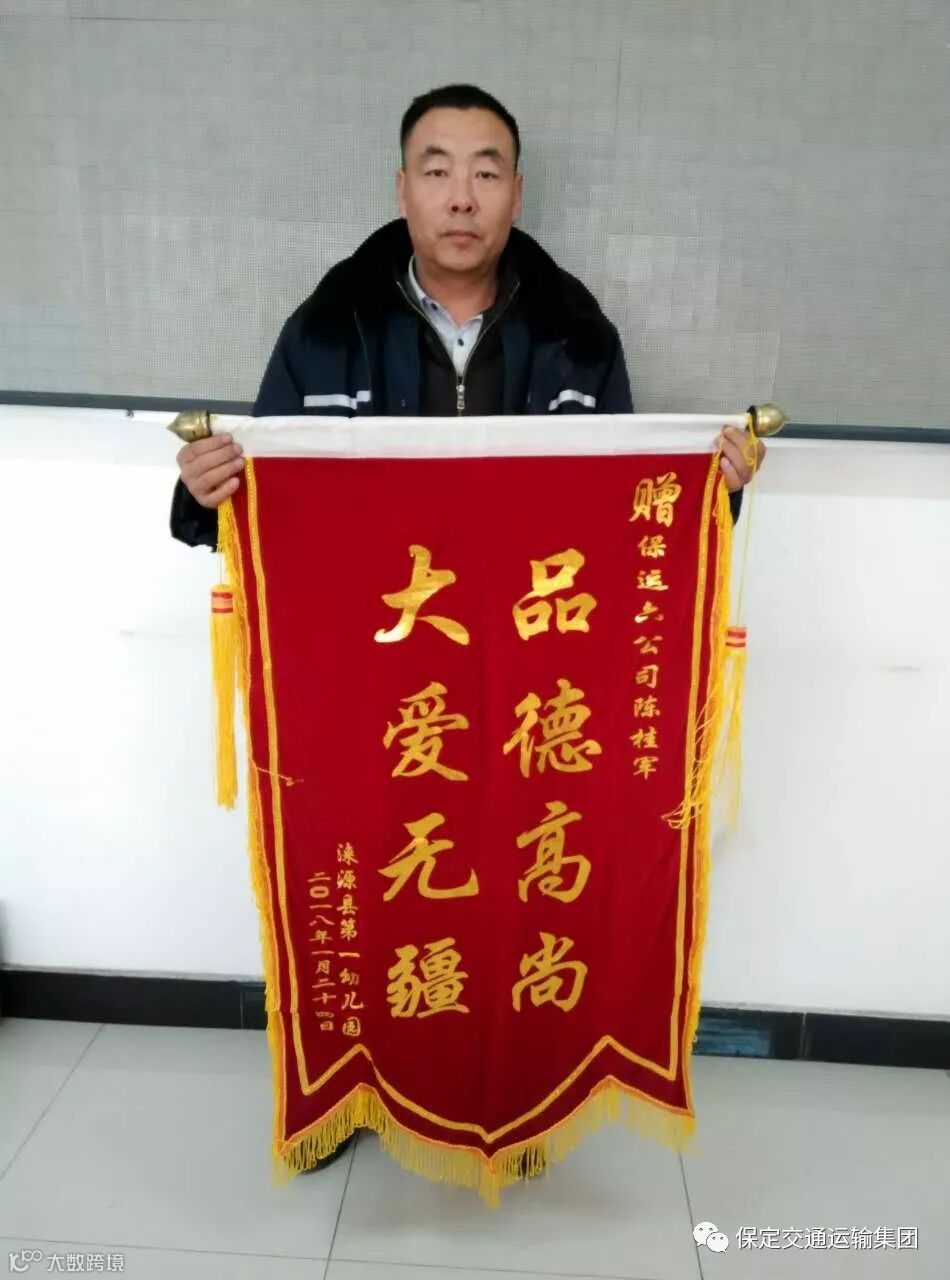 2018年1月24日上午,涞源县幼儿园王园长一行三人将一面写有“品德高尚 大爱无疆”的锦旗送到六公司,感谢六公司驾驶员陈桂军同志挺身而出,勇于救火的行为。