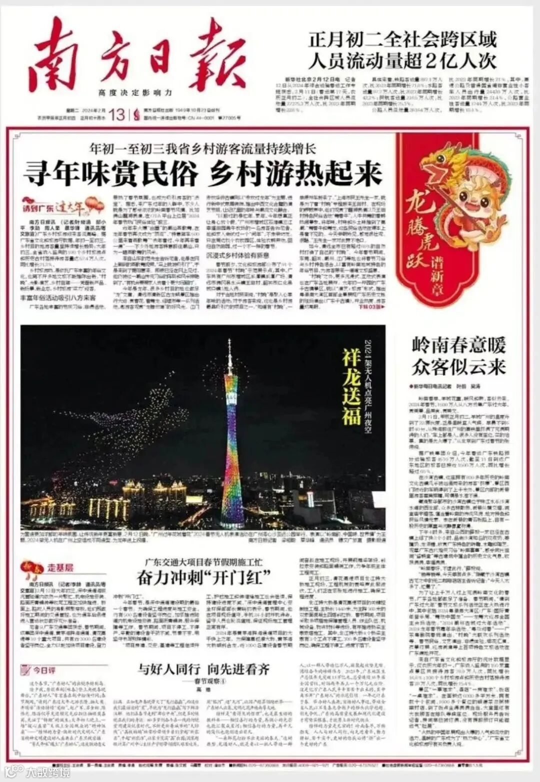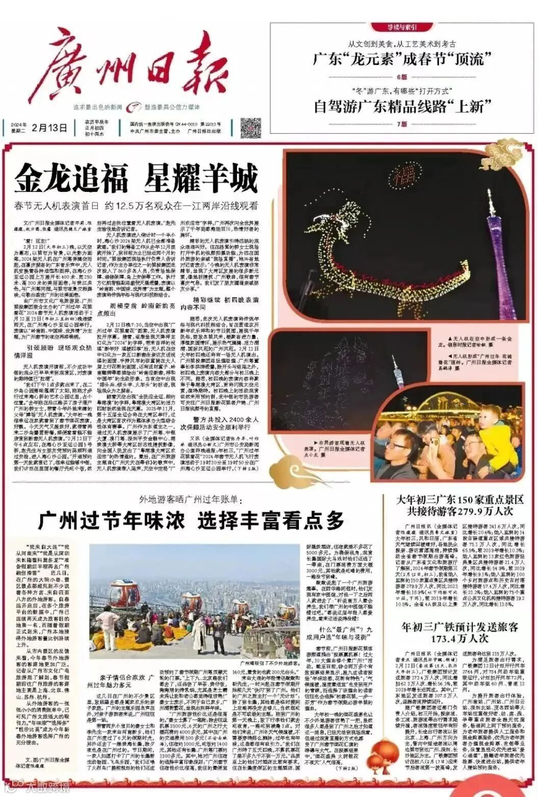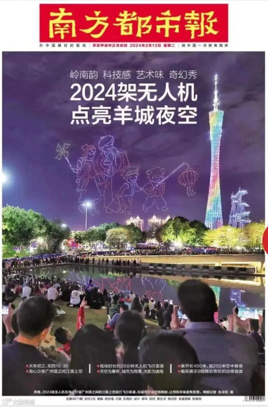 活动共计吸引超过20万市民游客到现场驻足观看,超过150万人次实时观看线上直播。活动获得新华网、光明网等中央媒体高度关注;其中,南方日报、广州日报、羊城晚报、南方都市报和信息时报12日、13日头版呈现正面活动盛况。新浪微博话题#广州2024架无人机巨龙腾空送福#累计阅读量超225万。