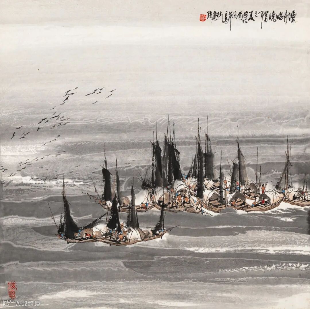 【款识】渔舟唱晚。癸酉年之夏写于南海岸边,杜应强。
