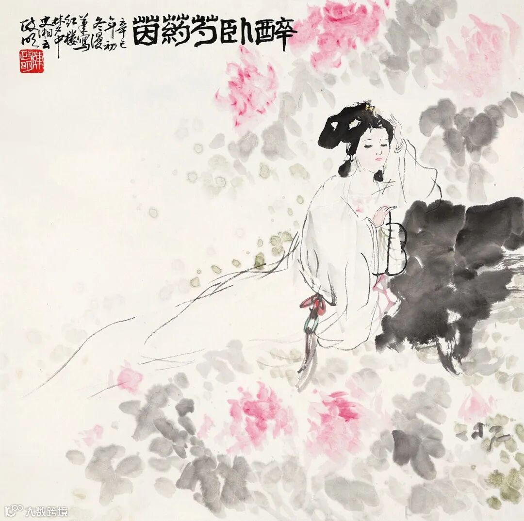 【款识】醉卧芍药茵。辛巳年初冬漫笔写红楼梦中史湘云。政明。