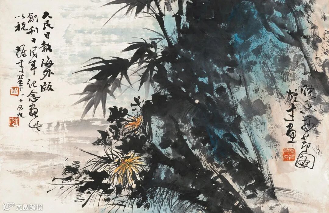 【款识】晚香高节图,雄才画。人民日报海外版创刊十周年纪念,画此以祝,雄才,时年八十又九。