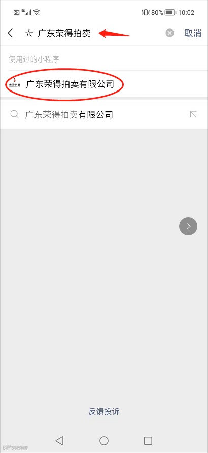 2.输入【广东荣得拍卖】点击进入“广东荣得网拍小程序”