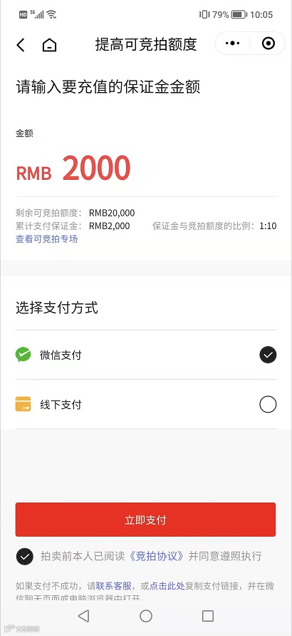 注:小程序出价需交保证金最低2000元人民币,放比系数为1:10(2000元最高可竞得2万元拍品,继续加价需自行增加保证金数额)