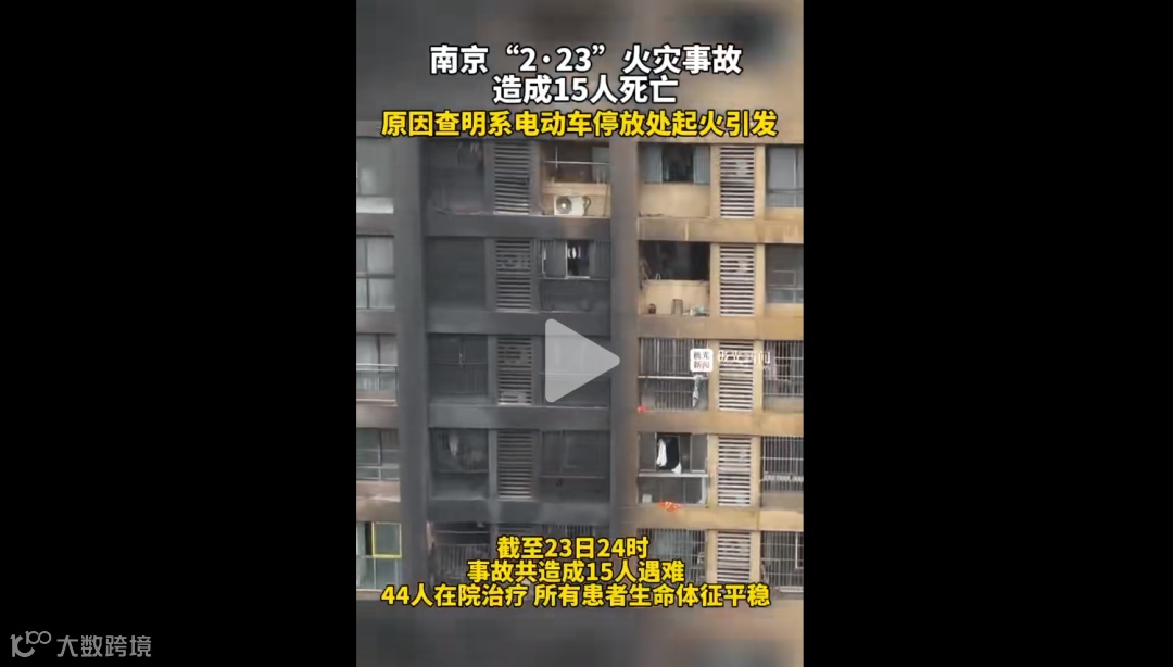 2024年2月23日4时39分,南京市小区楼层发生火灾,造成15人死亡,44人受伤。经初步分析,火灾为6栋建筑地面架空层停放电动自行车处起火引发!!