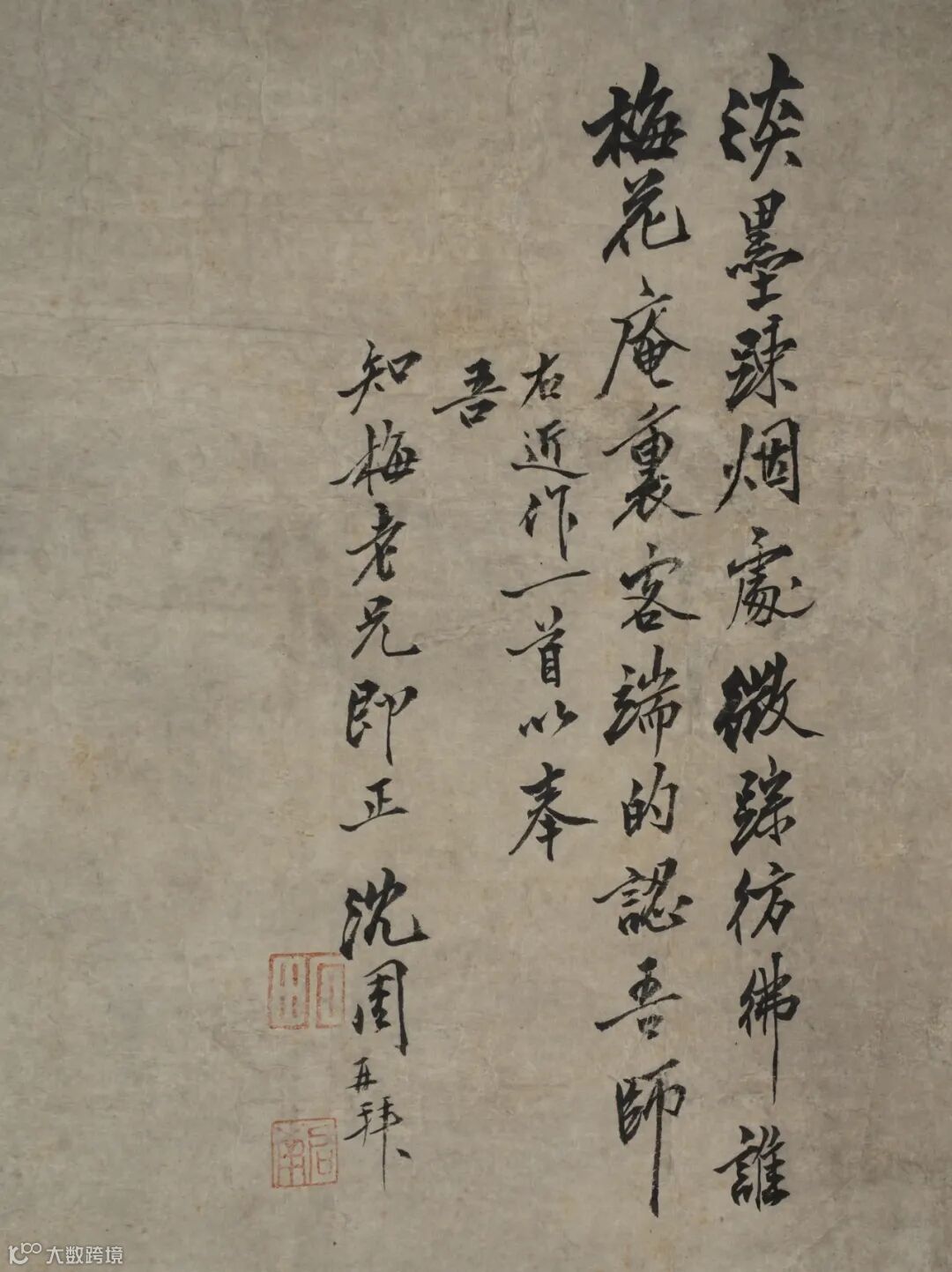 淡墨疏烟处,微踪仿佛谁。梅花庵里客,端的认吾师。右近作一首以奉吾知梅老兄即正,沈周再拜。
