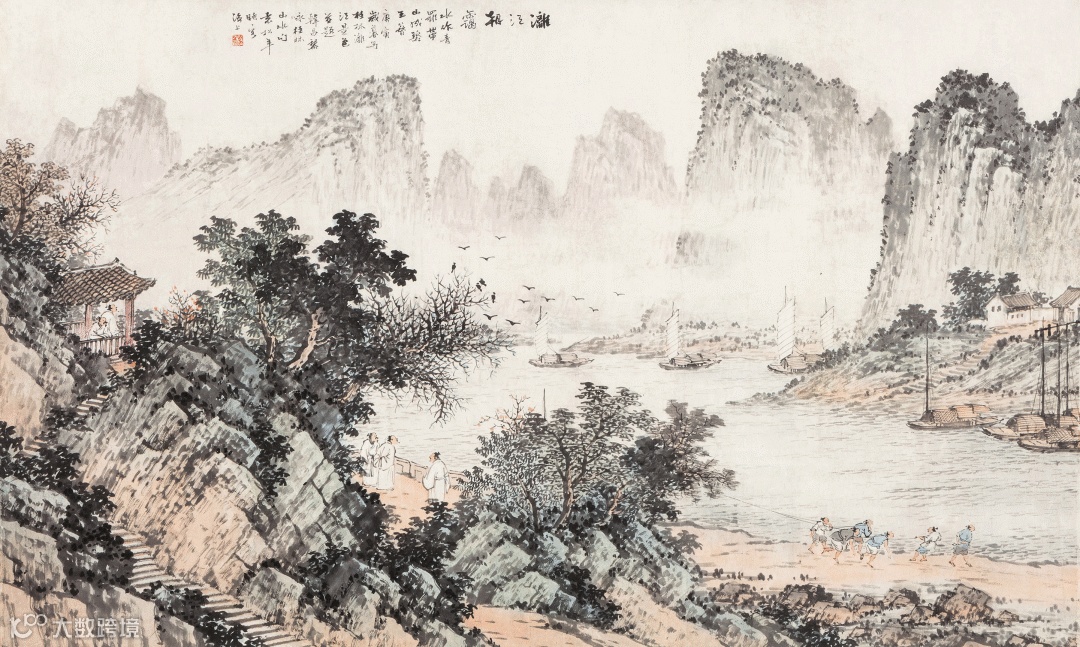 款识:水作青罗带,山成碧玉簪。庚寅岁暮写桂林漓江景色,并题韩昌黎咏桂林山水句,袁松年时客海上。