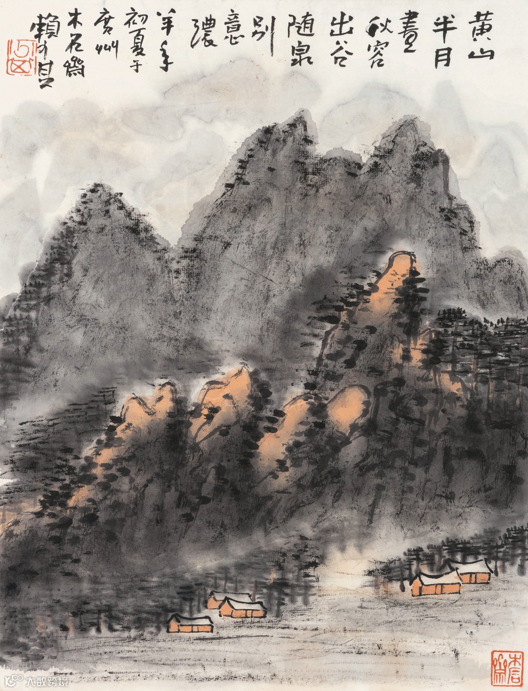 款识:黄山半月画秋容,出谷随泉别意浓。羊年初夏于广州木石斋,赖少其。