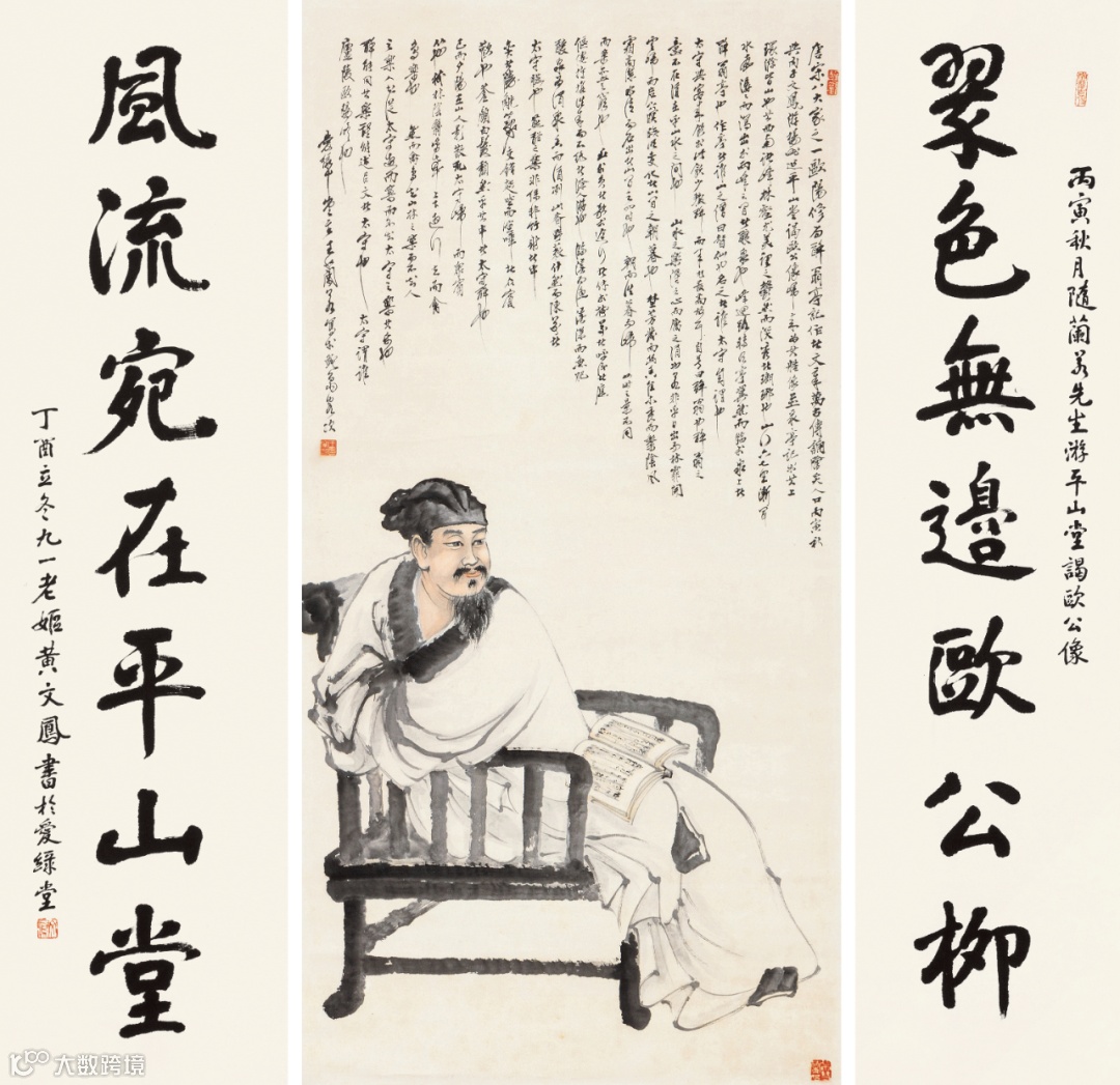 2.翠色无边欧公柳,风流宛在平山堂。丙寅秋月随兰若先生游平山堂谒欧公像,丁酉立冬九一老妪黄文凤书于爱绿堂。