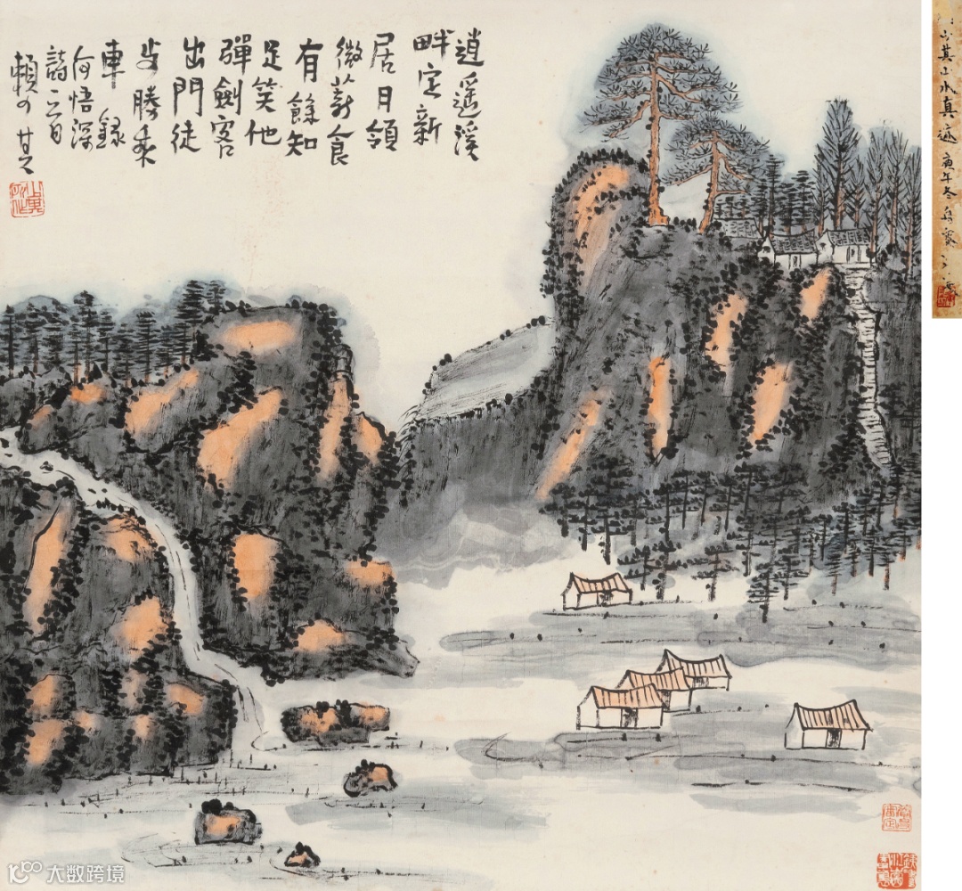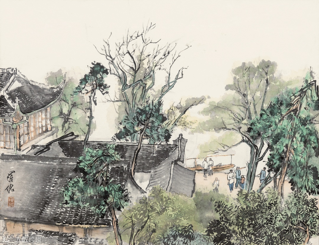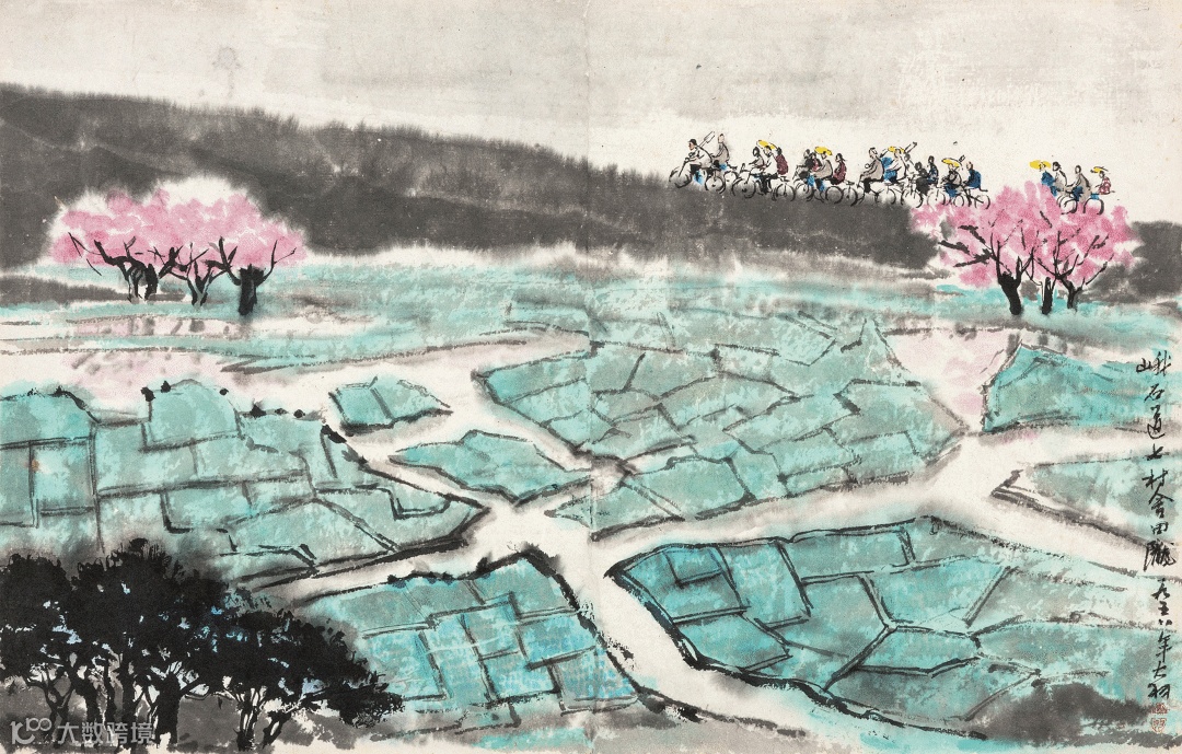 款识:峨石道上,村舍田陇。一九五八年,大羽。