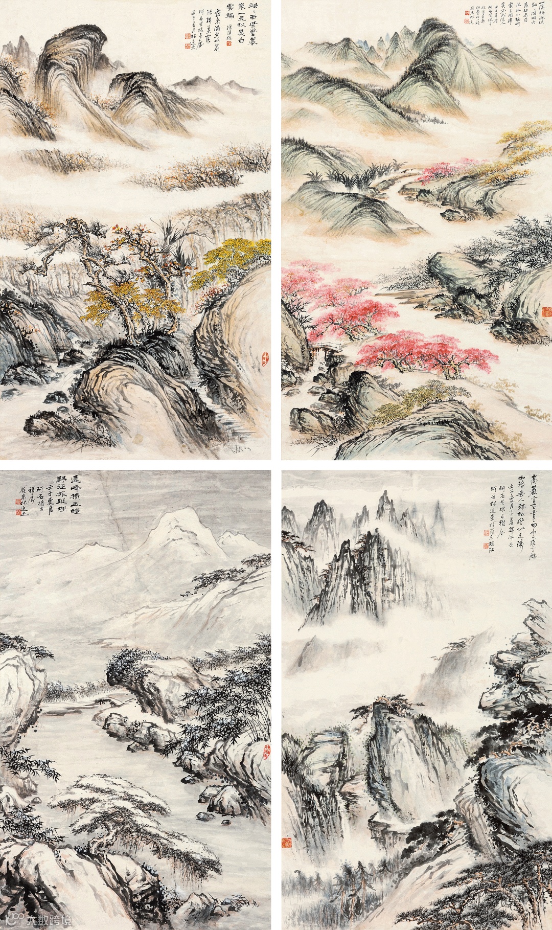 款识:1.飒飒西风响暮寒,一天秋思白云端。沧萍题。霜气满空山,萧疏残叶落。珂石贤棣之属,壬子夏月林逸画。2.远峰积玉皑,野径旅踪埋。壬子夏月,珂石棣台雅属,岭东林逸画。3.高岩含古青,白云绕其腰。山路无人迹,松风似走涛。壬子夏月炎暑挥汗,应珂石棣台雅属,阿春林逸画于岭东榕江。4.一溪新涨绿粼粼,满树夭桃红未匀。流水小桥何处去,问津奚必武陵人。壬子夏月,珂石贤棣台酷爱书画,特画此以赠,岭东林逸。