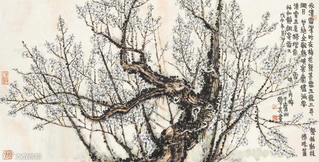 款识:冰清霜洁。昨夜梅花发。甚处玉龙三弄,声摇动、枝头月。梦绝。金兽爇。晓寒兰烬灭。要卷珠帘清赏,且莫扫、阶前雪。林和靖调寄《霜天晓角·梅》。戊午冬月于庐州,赖少其画。