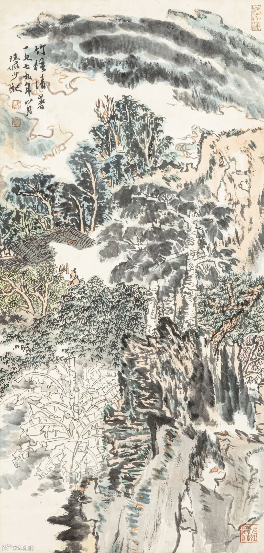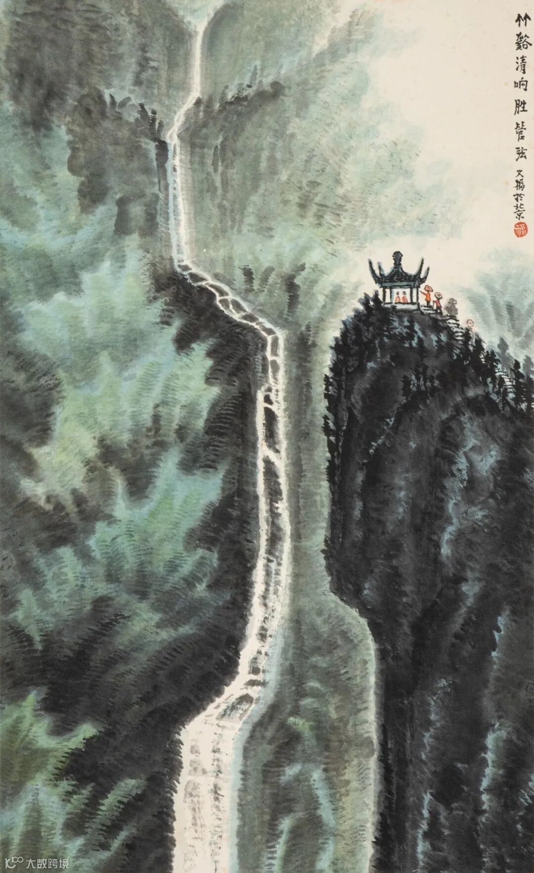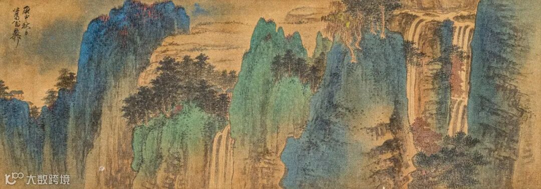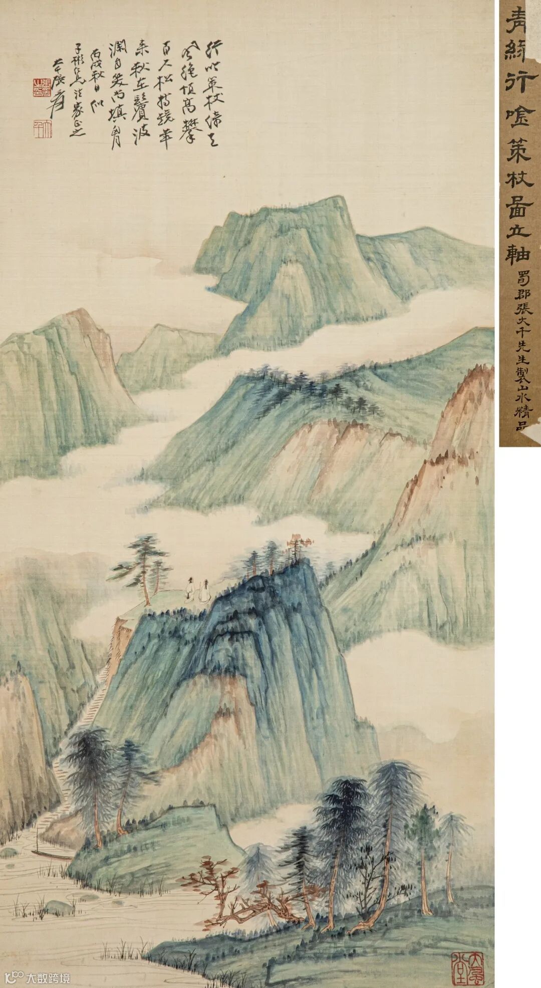 题签:青绿行吟策杖图立轴。蜀郡张大千先生制山水精品。