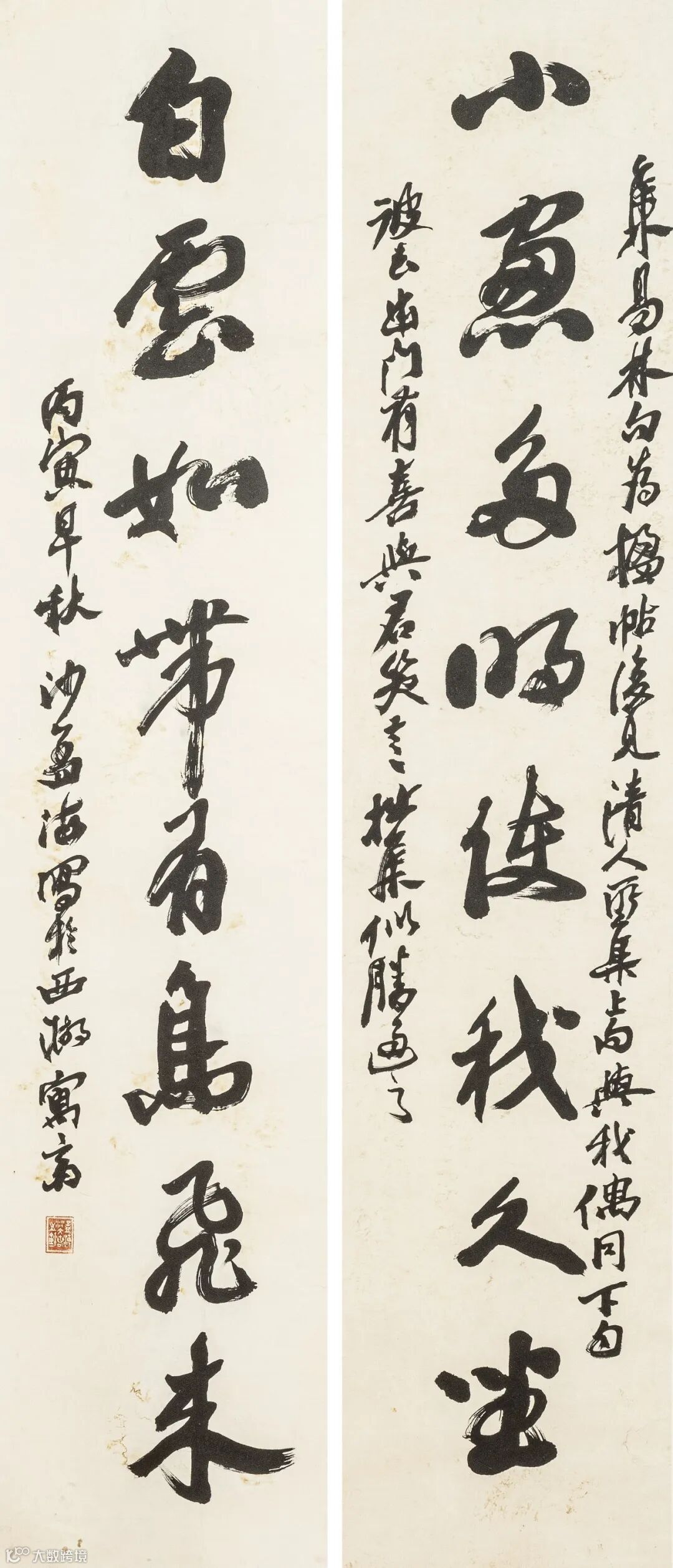 款识:集易林句为楹帖,后见清人所集上句与我偶同,下句彼云出门有喜与君笑言,拙集似胜过之。丙寅早秋,沙孟海写于西湖寓斋。