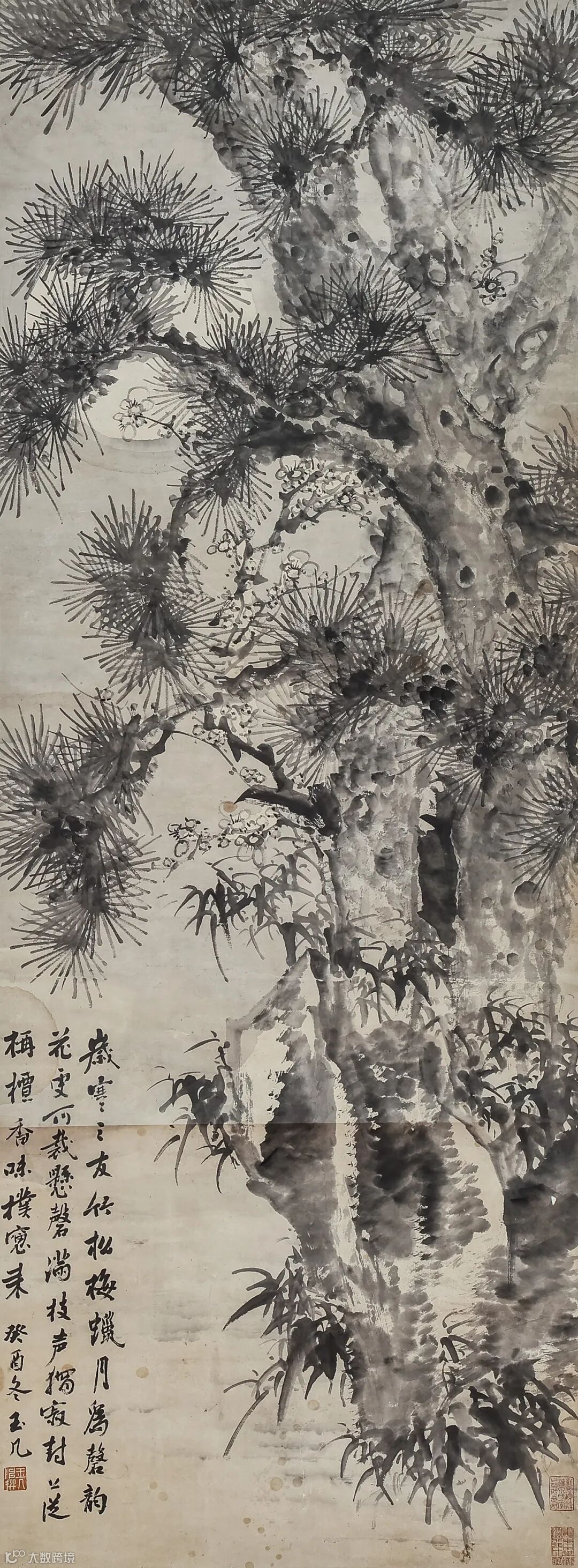 款识:岁寒三友竹松梅,蜡月为磬,韵花更可裁,悬磬满枝声独寂,封上从柟檀,香味扑窗来。癸酉冬,玉几。
