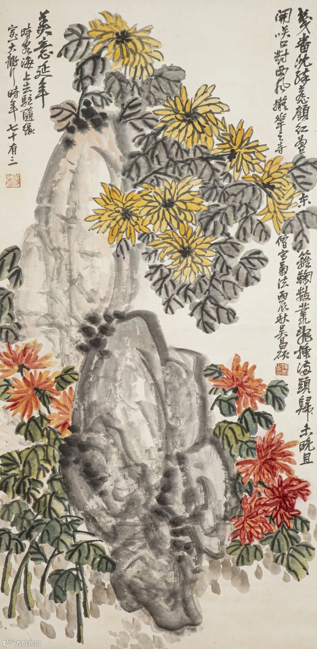 款识:美意延年。时客海上去驻随缘室,大聋时年七十有三。几番沉醉惹颜红,为有东篱鞠数丛。飞插满头归未晚,且开笑口对西风。拟花之寺僧写菊法,丙辰秋吴昌硕。